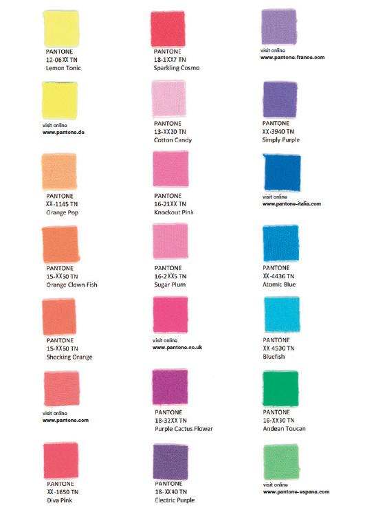 21 colori super luminosi Pantone. Tra questi 14 sono qualificati come “Vero” colore fluorescente, nel senso che assorbono la luce ultravioletta invisibile e la riemettono come luce visibile, aumentando così la luminosità del colore percepito. Tuttavia, i colori contenenti coloranti fluorescenti sono, per natura, meno resistente agli effetti degradanti della luce e dell’acqua anche se esistono trattamenti che possono essere aggiunti per aumentare la solidità e durata dei colori nel tempo.
